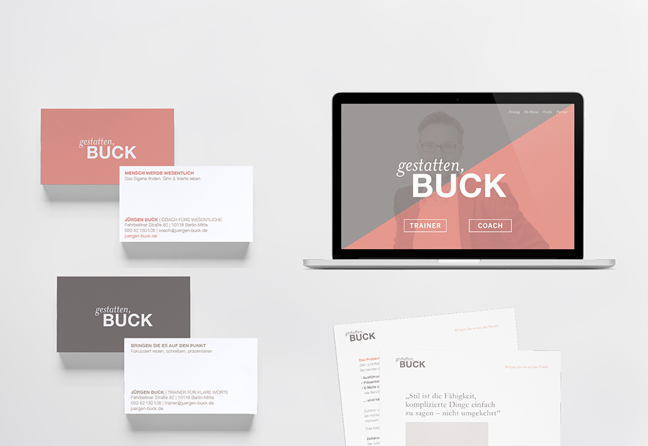 Jürgen Buck ist etablierter Kommunikationstrainer. Das Rebranding sollte dem hinzugewonnen Bereich Coaching Rechnung tragen. Die Wortmarke „gestatten, BUCK“ rückt die Person Jürgen Buck humorvoll und elegant zugleich in den Mittelpunkt der Marke, die reduzierte Gestaltung und transparenten Fotografien nehmen sich wieder vornehm zurück. Ein perfekter Auftritt für eine „hanseatische“ Persönlichkeit!