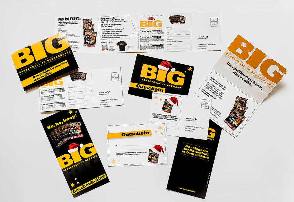Gestaltung diverser Drucksachen für das Magazin BIG – Basketball in Deutschland innerhalb eines bestehenden Corporate Designs.