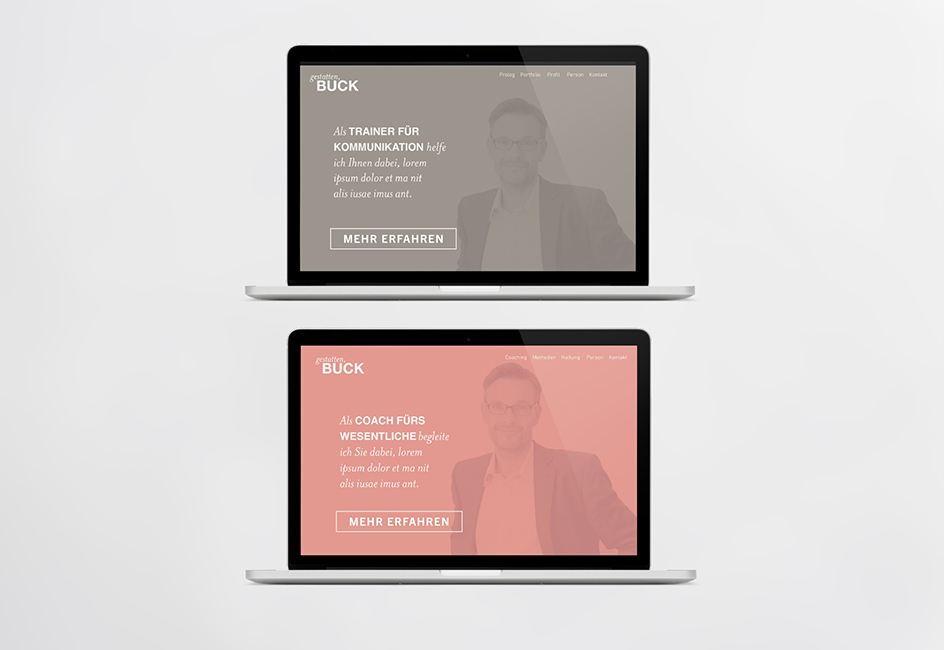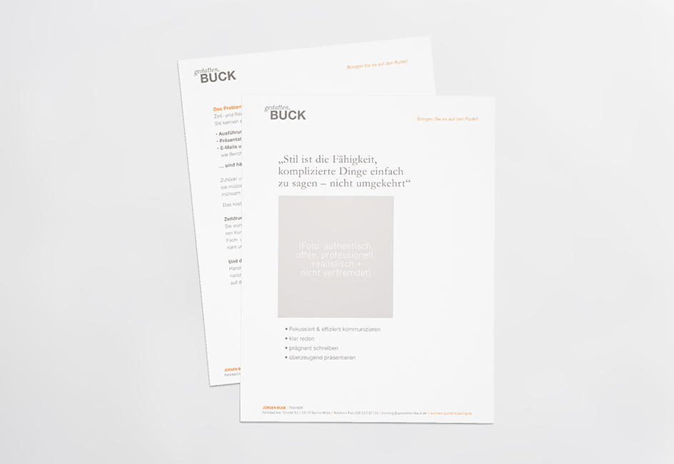 Jürgen Buck ist etablierter Kommunikationstrainer. Das Rebranding sollte dem hinzugewonnen Bereich Coaching Rechnung tragen. Die Wortmarke „gestatten, BUCK“ rückt die Person Jürgen Buck humorvoll und elegant zugleich in den Mittelpunkt der Marke, die reduzierte Gestaltung und transparenten Fotografien nehmen sich wieder vornehm zurück. Ein perfekter Auftritt für eine „hanseatische“ Persönlichkeit!